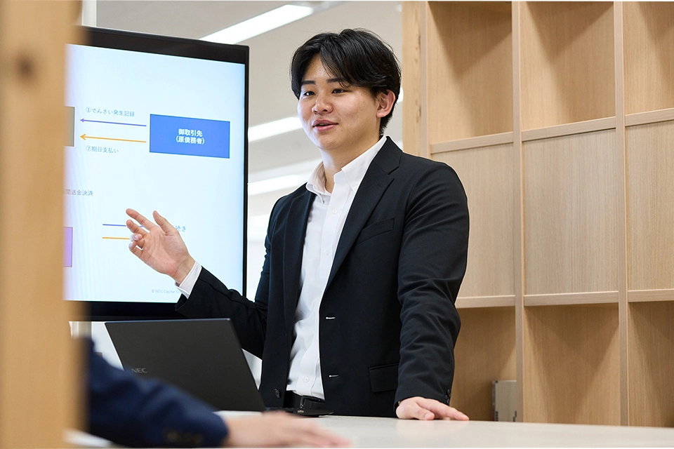 まずは金融知識と営業スキルを磨いて、会社の利益に貢献することが目標です。既存顧客への営業活動はもちろんのこと、現在は新規顧客の開拓も担っているため、大きな案件を自ら獲得して会社にインパクトを与えられるような仕事をしたいと思っています。しかし、知識も経験もまだまだ。財務分析のスキル向上が求められているほか、お客様からはリースに限らず幅広いご相談をいただくので、再生可能エネルギーや不動産など、他部門の業務知識も身につける必要があると感じます。日々の勉強に加えて、先輩や同期に質問をして知識を吸収するようにしています。NECキャピタルソリューションは働きやすく、社員が挑戦できる環境が整っているので、その中で必ず目標を達成したいと思っています。